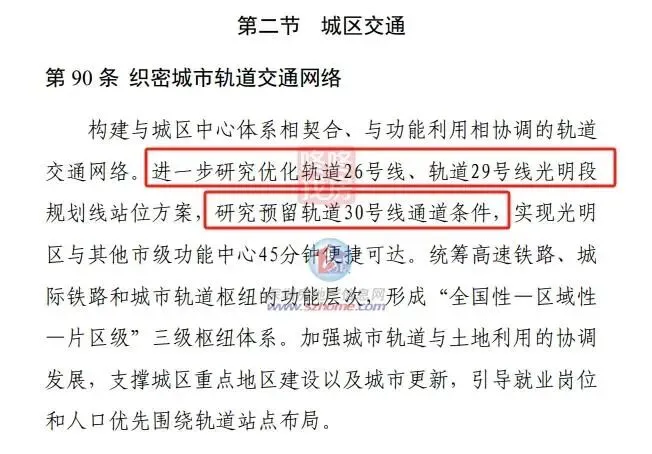 光明区在地铁方面的规划显示:进一步研究优化轨道26号线、轨道29号线光明段规划线站位方案,研究预留轨道30号线通道条件,实现光明 区与其他市级功能中心45分钟便捷可达。