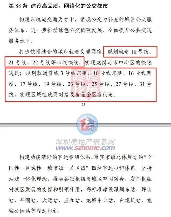 而龙岗区在交通部分:有提到规划轨道18号线、 21号线、22号线等市域快线,实现龙岗与市中心区的快速通达;规划轨道普线 3 号线东延、10号线东延、16号线南延、17号线、19号线、23号线、25号线、27号线、31号线,实现区域性轨网对接及覆盖全区各街道。
