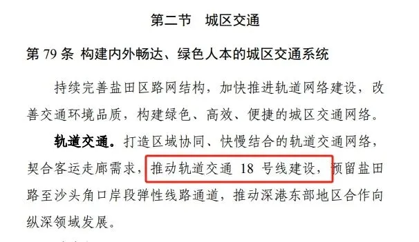 盐田在轨道交通的规划方面,有提到推动轨道交通18号线建设,预留盐田路至沙头角口岸段弹性线路通道,推动深港东部地区合作向纵深领域发展。