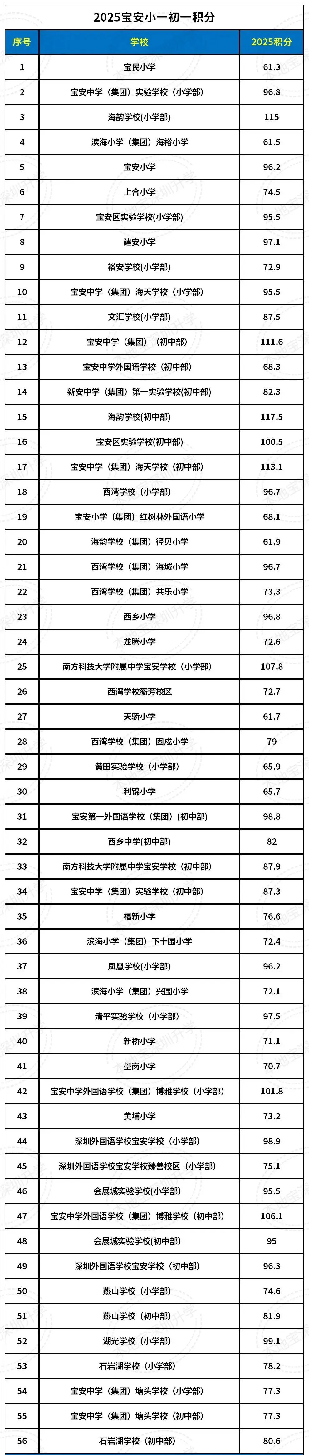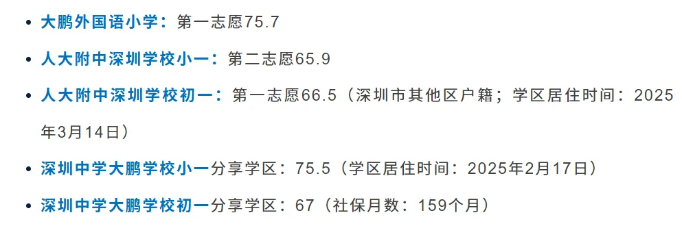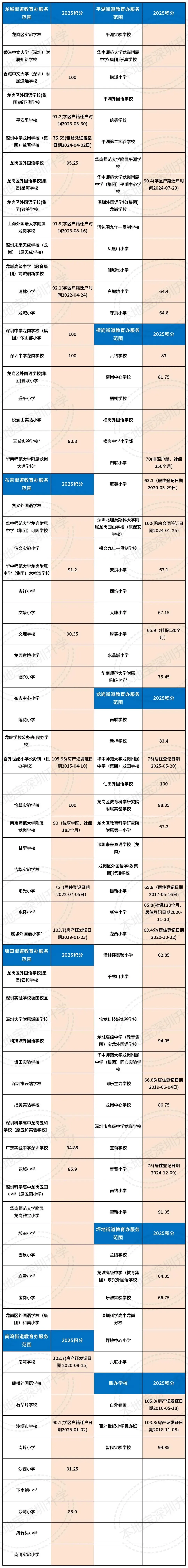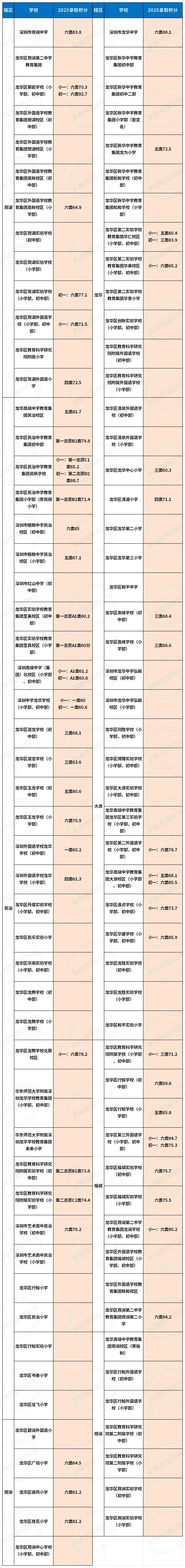 目前有收集到龙岗53所公办小一的2025年录取积分,详见下表,可以点击放大查看↓↓↓