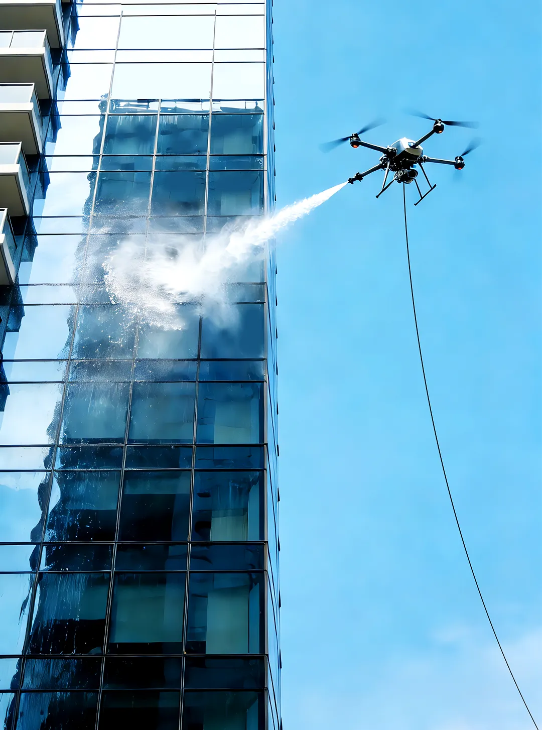 主力机型采用4旋翼冗余设计(X型对称布局,单个电机故障仍可稳定飞行),抗风≥6级,可胜任600米以上超高空作业。实测清洗速度1200㎡/小时,效率较人工提升3倍;支持5G远程集群调度,单日基础清洗量可达5000㎡。3. 精准环保闭环管控