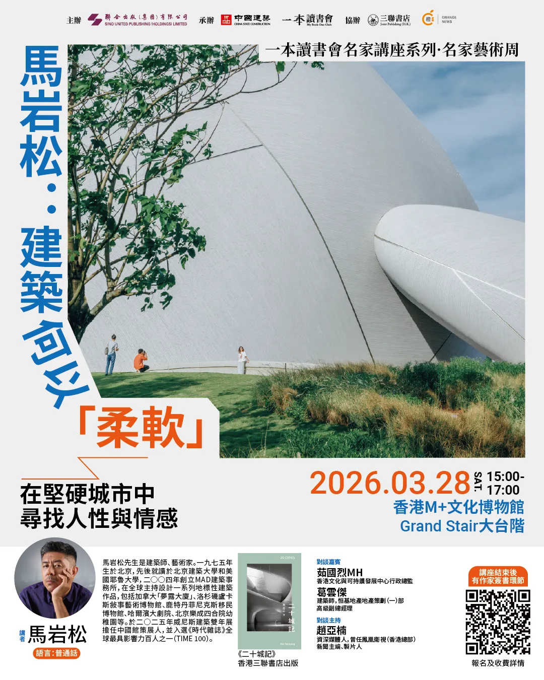 3月28日(本周六),「一本讀書會」邀請著名建築師馬岩松來港舉辦「名家講座」,圍繞其著作《二十城記》,帶領我們超越技術層面,探討建築與城市文化、人文精神的共生關係,思考現代建築如何為城市注入柔軟力量。