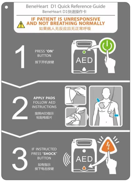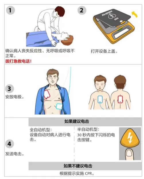 AED的使用过程可总结为简单三步:开机、连接、放电,核心原则就是:它怎么说,你怎么做!只是不同机型,操作方法稍有区别。