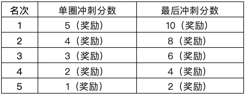 5️⃣总决赛骑行5圈,裁判有权对冲刺圈末位明显落后选手执行关门。(选手按照关门时间倒序排名,奖励不变)。第1-3圈为中立骑行圈,2-4-5圈为冲刺圈,前五名获得对应的5-4-3-2-1积分,最后一圈前五名通过的运动员分数翻倍,获得10-8-6-4-2积分。如下图