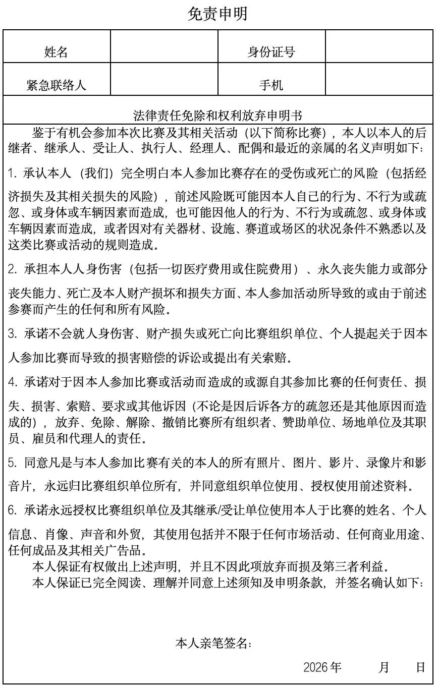 3、参加者自愿放弃对赛事主办方、承办方、协办方、赞助方、策划推广方及相关所有个人和单位提出针对比赛中发生的任何损失、伤害进行任何索赔、法律诉讼的权利,这种损失、伤害包括但不限于自身缺乏耐力、体力、技术、经验或因其他参与者不当作为或与其他方发生碰撞、器材问题等。