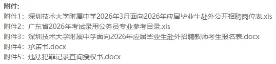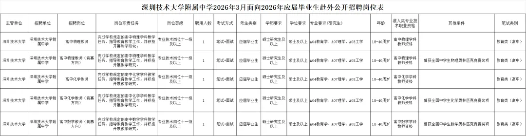 深圳技术大学附属中学2026年3月面向2026年应届毕业生公开招聘教师8名,应聘人员可通过深圳技术大学附属中学学校网站(https://sztuhs.sztu.edu.cn/)、深圳技术大学(https://www.sztu.edu.cn/)、深圳市人力资源和社会保障局(http://hrss.sz.gov.cn/)查阅具体的招聘信息,具体岗位见《深圳技术大学附属中学2026年3月面向2026年应届毕业生赴外公开招聘教师岗位表》(附件1,以下简称《招聘岗位表》)。现就有关事项公告如下: