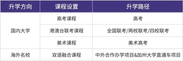 开设国内升学方向的高考课程、港澳台联考课程、高考美术课程;通过小班制精细化教学辅导和资深名师教学,让学生们实现低进高出、中进优出。