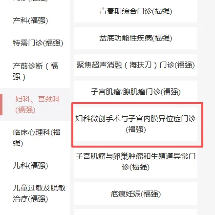 在“深圳市妇幼保健院”菜单栏点击【就诊服务】→【门诊服务】→【预约挂号】→【福强院区】→【妇科/宫颈科(福强)】→【妇科微创手术与子宫内膜异位症门诊(福强)】