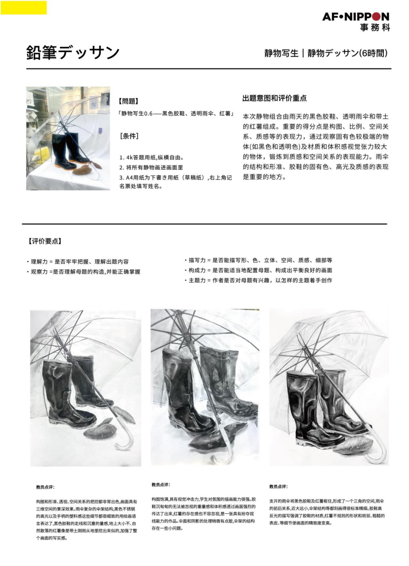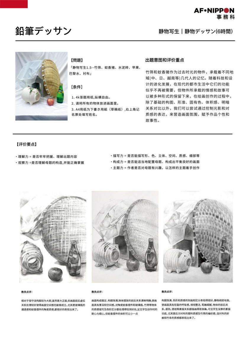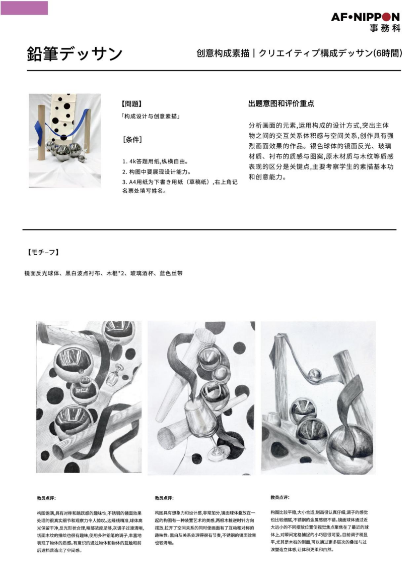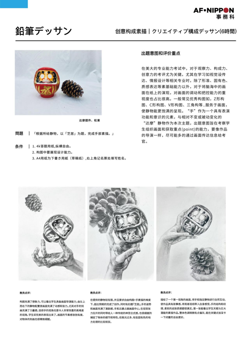 不同于国内联考侧重基础造型,日式素描更看重观察力、构成力、创意力与质感表达,考官要看到的不只是“画得像”,而是你作为创作者的画面导演能力。