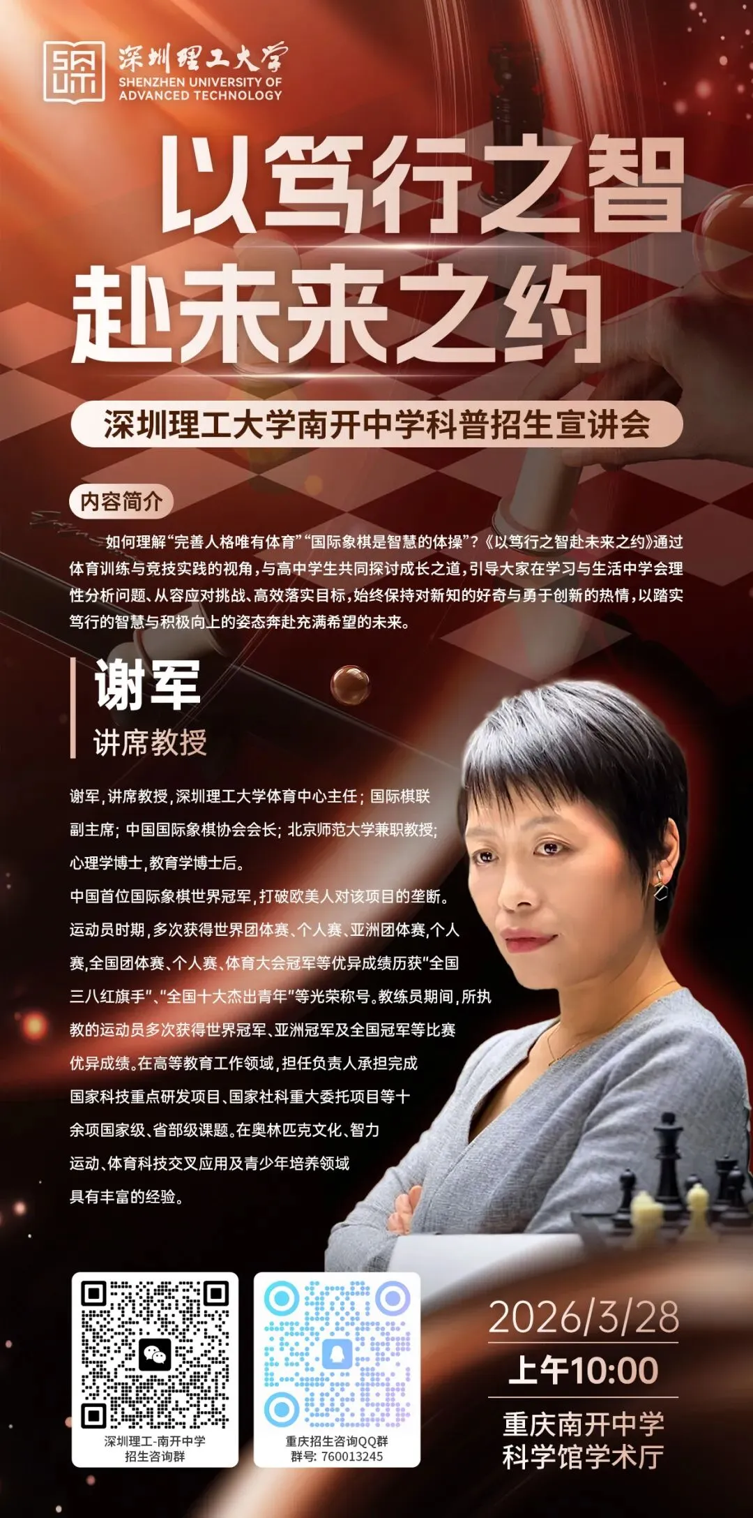 谢军,讲席教授,深圳理工大学体育中心主任;国际棋联副主席;中国国际象棋协会会长;北京师范大学兼职教授;心理学博士,教育学博士后。