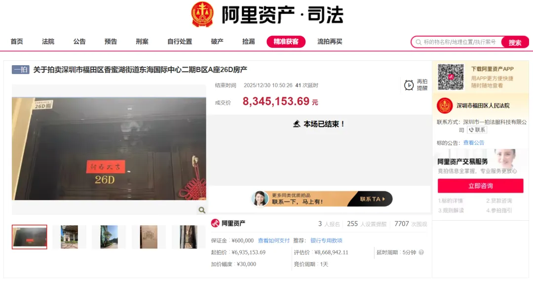 2025年12月30日10时50分,由深圳市福田区人民法院负责处置的深圳市福田区香蜜湖街道东海国际中心二期B区A座26D房产,在阿里资产平台历经41次延时、47轮激烈竞价后,最终以8,345,153.69元的成交价圆满落槌!