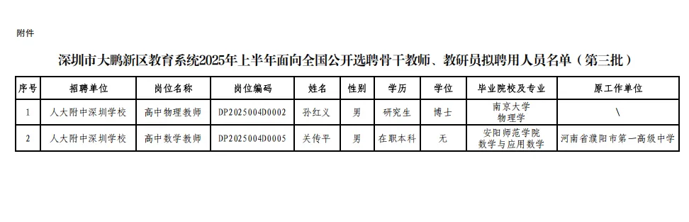 附件:深圳市大鹏新区教育系统2025年上半年面向全国公开选聘骨干教师、教研员拟聘用人员名单(第三批)
