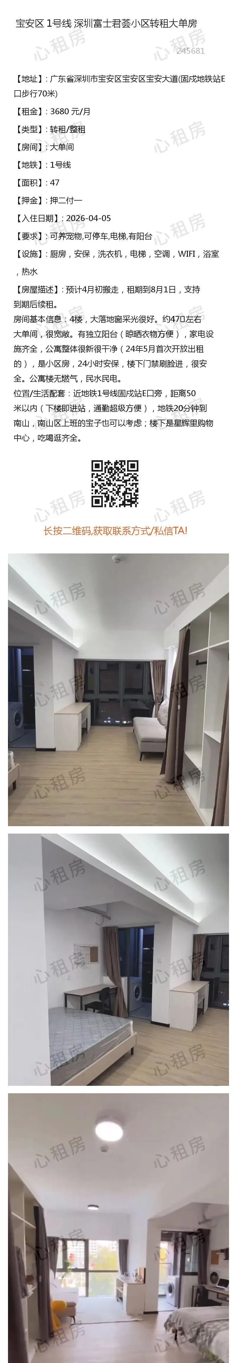 深圳租房【宝安3则】房源①:1号线深圳宝安富士君荟小区转租大单房3680元/月;房源②:.........