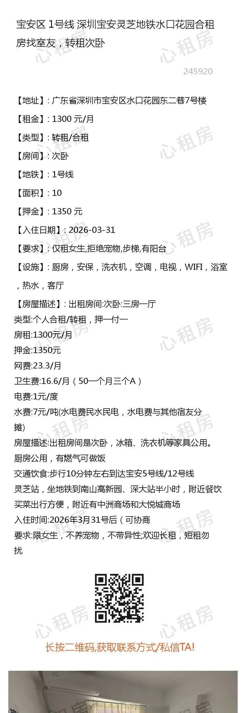 1、所有房源信息均由网友投稿,委托本公众号/心租房(homhere.cn)发布,房源的真实性、合法性由提供者负责。2、请务必核实双方身份信息(身份证)、房产权属(产权证明)、转租权利(租赁合同)等基本信息。3、请务必实地考察房源并确保与出租方提供的基本信息一致。4、切勿轻易支付定金、保证金、打赏等,建议签订《租赁合同》后再进行交易。5、双方在房屋租赁过程中产生的一切纠纷,均与本公众号/心租房(homhere.cn)无关。6、近期欺诈团伙在境外以相亲交友、租房、国际包裹等名义实施杀猪盘、诱导下载未知app等进行刷单返利等欺诈的行为较多,请先确认对方身份,保护个人隐私和财产安全。