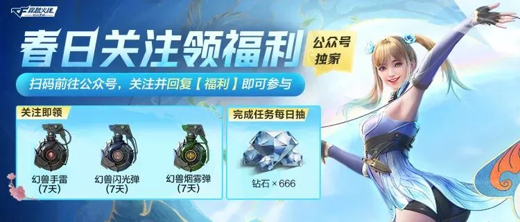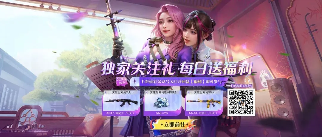 关注公众号即可领取钻石*20,关注满30天即可领取M4A1-悠悠云(15天)~