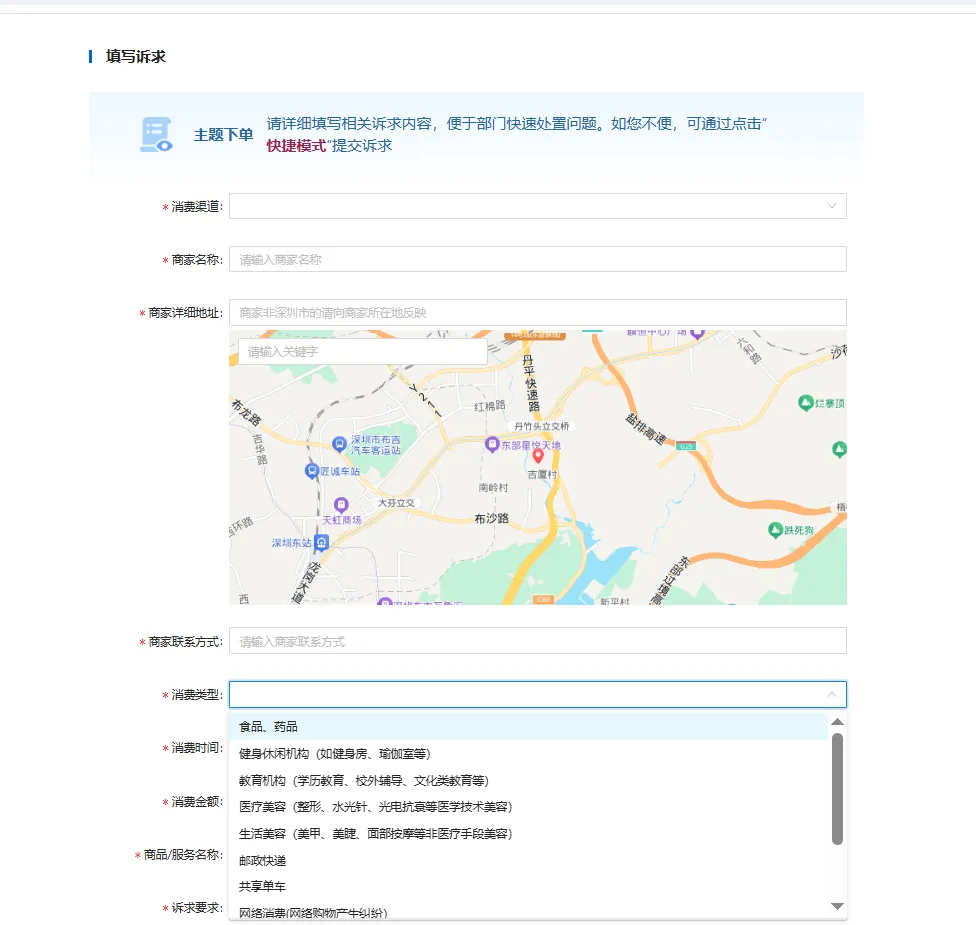 随便点击一个“市场监管”,然后选择“消费投诉”,可以看到做了一个结构化的模板表单,说明当地还是做了一些工作,想提高诉求流转效率的。