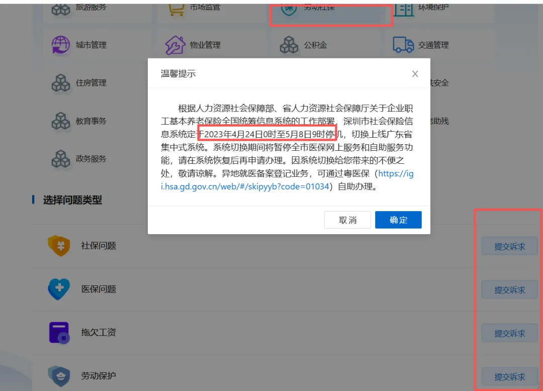 我们以“劳动社保”这个主题诉求为例,点开后,下面会依次展开社保问题、医保问题、拖欠工资 、劳动保护四个问题类型,后面的点击诉求按钮点击后,都会弹出温馨提示“根据人力资源社会保障部、省人力资源社会保障厅关于企业职工基本养老保险全国统筹信息系统的工作部署,深圳市社会保险信息系统定于2023年4月24日0时至5月8日9时停机,切换上线广东省集中式系统。系统切换期间将暂停全市医保网上服务和自助服务功能,请在系统恢复后再申请办理。因系统切换给您带来的不便之处,敬请谅解。异地就医备案登记业务,可通过粤医保自助办理。”