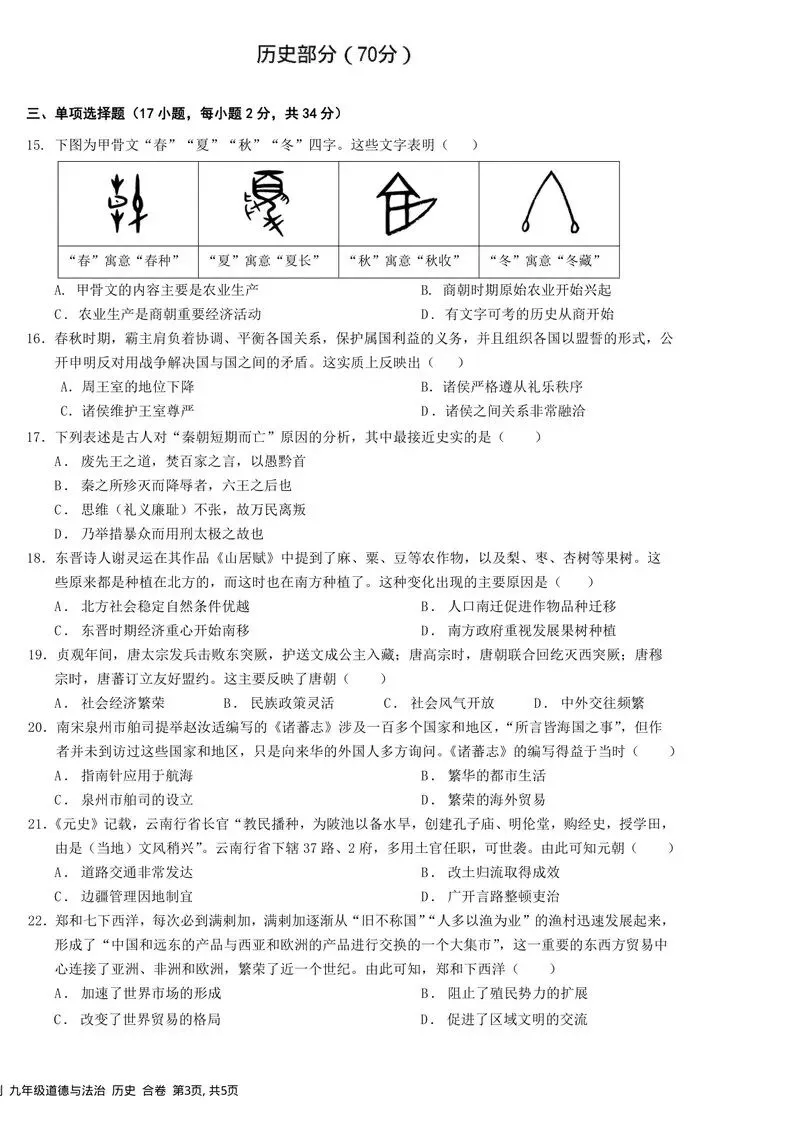 初三 | 历史 | 模考卷 | 下学期 | 深圳市南山区育才集团