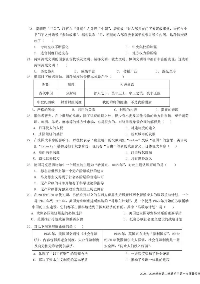 2024-2025学年深圳市南山区育才集团九年级(下)第一次模考历史试卷