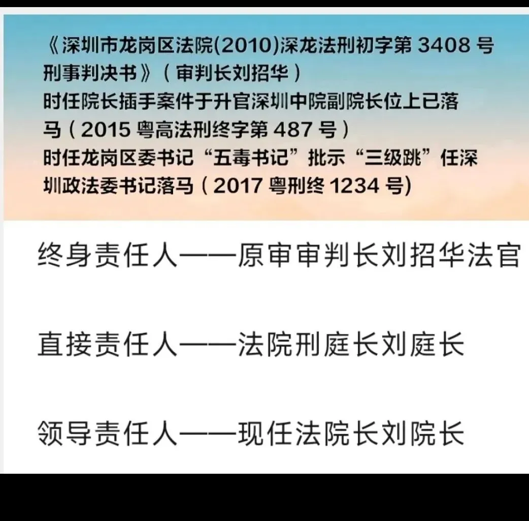 (2010)深龙法刑初字第3408号(审判长刘招华,时任院长插手案件于深圳中院副院长位上已落马,时任区委书记批示的“三级跳”深圳政法委书记位上已落马,现任院长刘一粟)