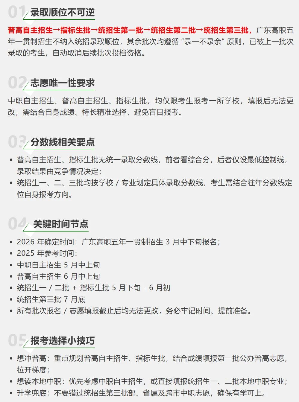 录取批次的选择直接决定升学方向!家长和考生需结合自身成绩、兴趣特长、户籍及就读意愿,逐一梳理各批次报考要求,科学规划志愿填报。提前吃透政策、精准定位自身,才能在中考升学中抢占先机,顺利迈入心仪的学校和专业!