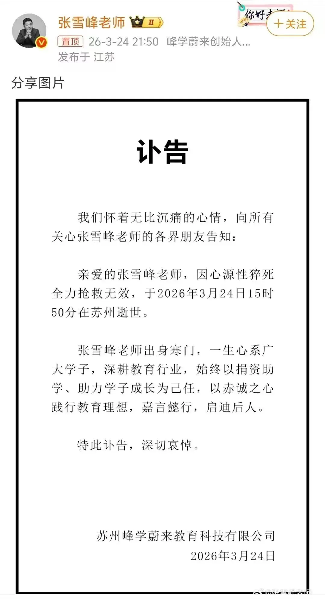 据新华社消息,3月24日,苏州峰学蔚来教育科技有限公司发布讣告称,张雪峰因突发疾病,经抢救无效不幸去世。