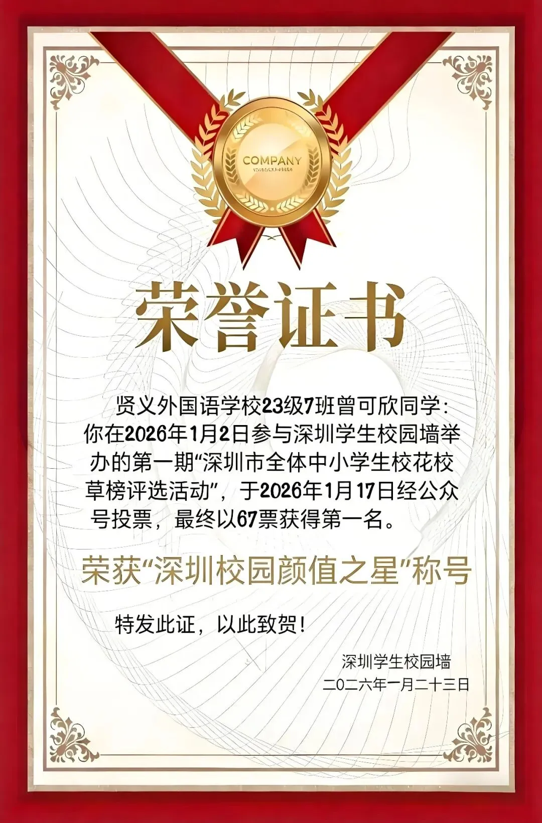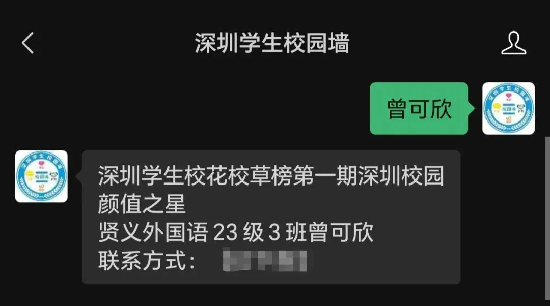 大家好我是贤义外国语学校23届7班曾可欣,喜欢我的闺蜜可以找我扩列好吧!我超好相处,打王者的也可以加我!我特别厉害啥!在龙岗附近的闺蜜也可以加我一起玩,只加在校学生18+的别来。贤义外国语学校23级7班曾可欣同学在2026年1月2日,参与深圳学生校园墙举办的第一期“深圳学生校花校草榜评选活动”,于2026年1月17日经公众号投票,最终以67票获得第一名荣获“深圳校园颜值之星“称号。特发此证,以此致贺!如何获取校深圳学生校花校草榜第一期深圳校园颜值之星曾可欣联系方式?关注公众号【深圳学生校园墙】,后台回复关键词【曾可欣】即可获取联系方式。如何获取深圳学生校花校草榜第一期参赛选手联系方式?关注公众号【深圳学生校园墙】,后台回复关键词【校花校草第一期】即可获取联系方式。