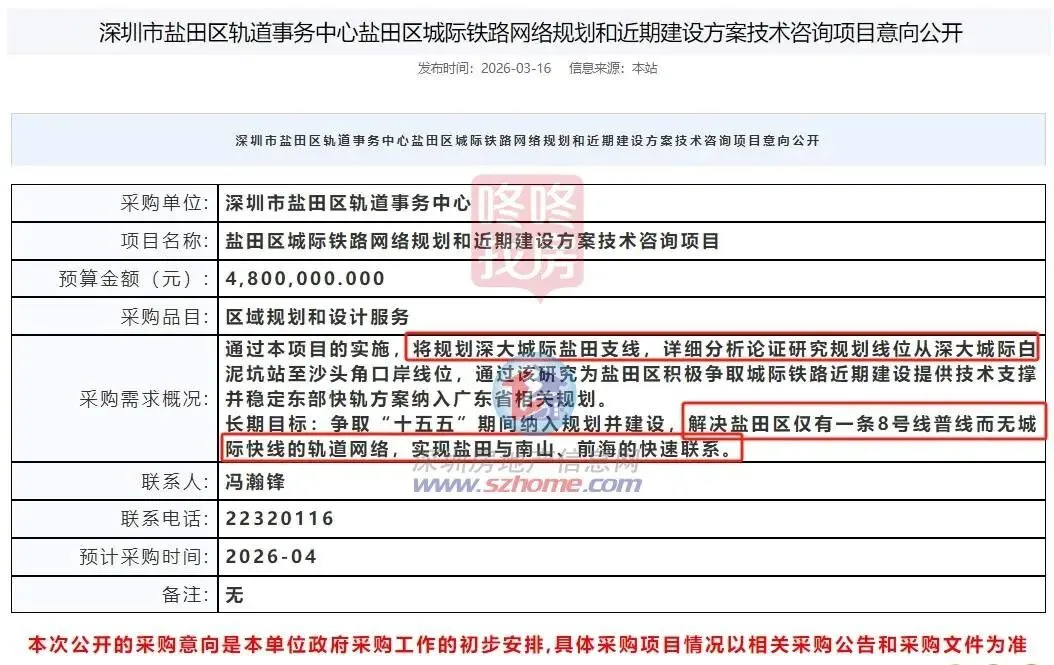 近日,盐田区城际铁路网络规划和近期建设方案技术咨询项目意向公开,480万进行深大城际盐田支线规划建设方案咨询。