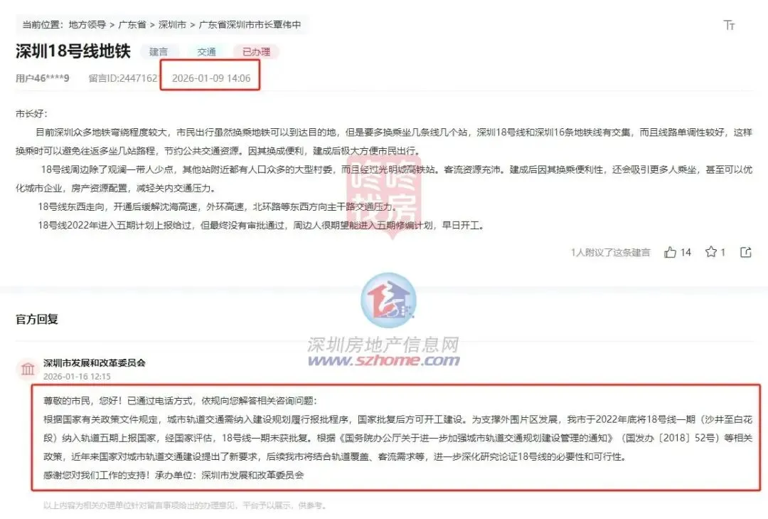 官方回复普遍指出,18号线一期此前上报未获批复。近年来国家对城市轨道交通建设提出新要求,深圳将结合轨道覆盖、客流需求等因素,进一步深化研究论证18号线的必要性与可行性。