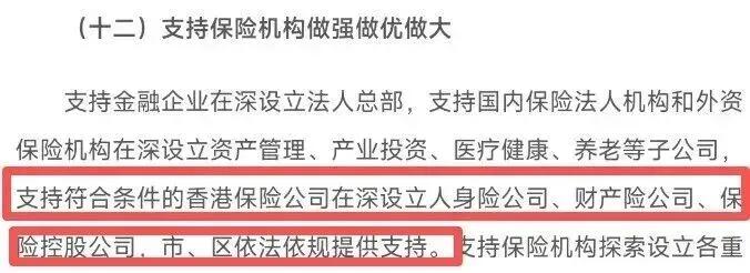 “支持符合条件的香港保险公司在深设立人身险公司、财产险公司、保险控股公司,市区依法依规提供支持。”