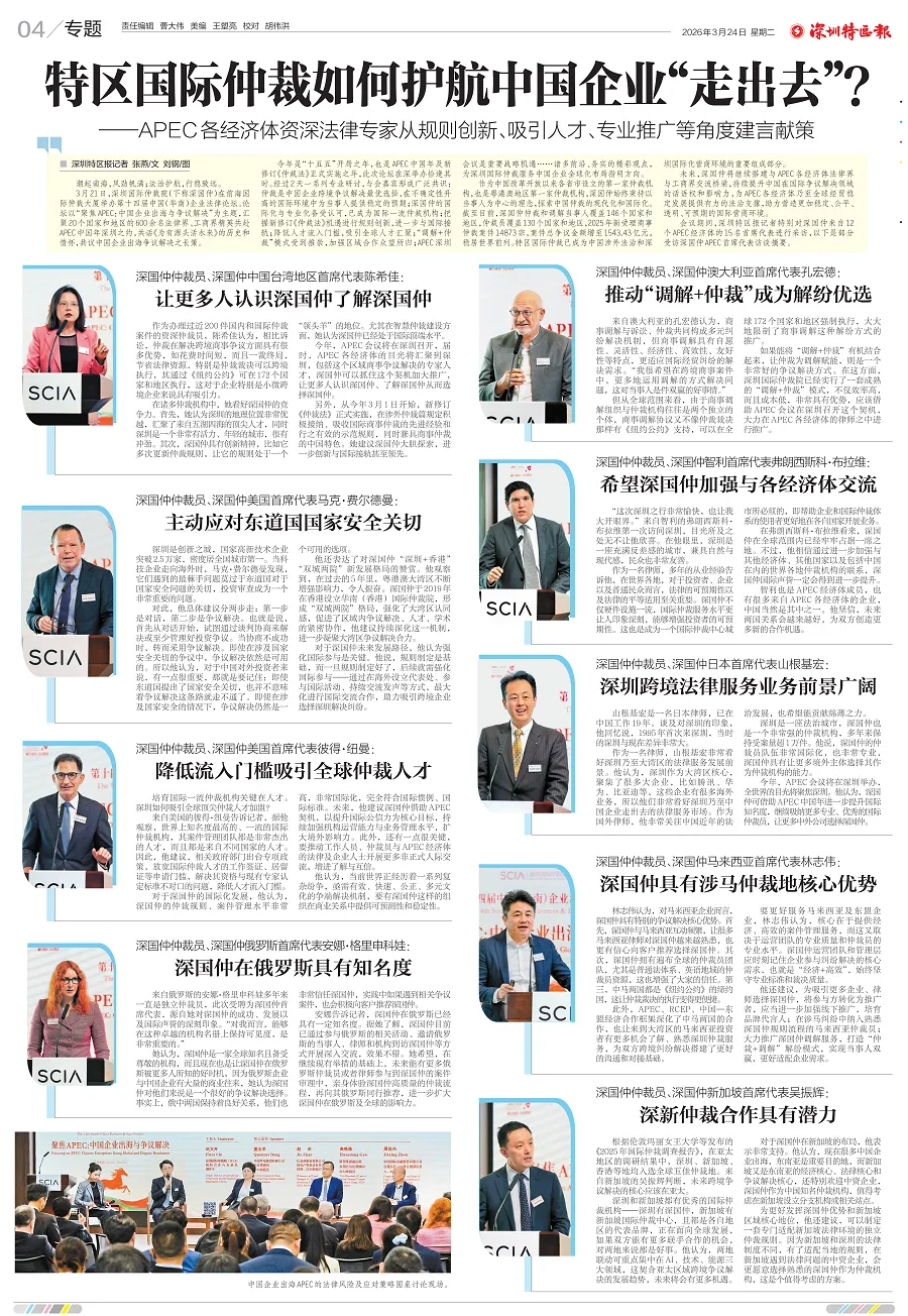 2026年3月21日,深圳国际仲裁院(SCIA)在深圳前海举办第十四届中国(华南)企业法律论坛,以“聚焦APEC:中国企业出海与争议解决”为主题,邀请来自中国台湾地区、美国、俄罗斯、新加坡、马来西亚等12个APEC经济体的15名专业人士进行专题发言。3月24日,《深圳特区报》刊发整版报道《特区国际仲裁如何护航中国企业“走出去”?——APEC各经济体资深法律专家从规则创新、吸引人才、专业推广等角度建言献策》,报道内容如下。