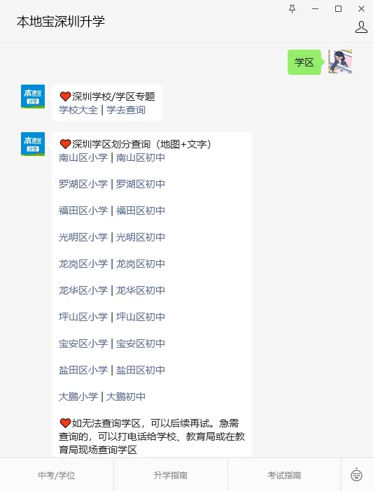 在“本地宝深圳升学”公众号对话框回复学位,即可获取深圳各区学位申请最新政策信息
