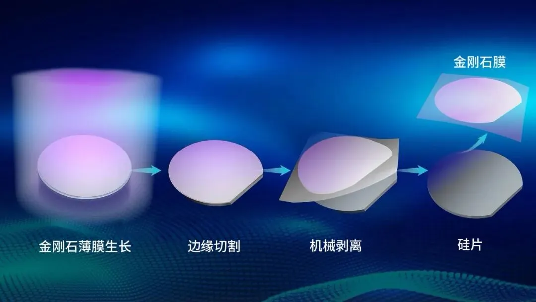 然而传统的制备技术难以实现大规模、超平整金刚石薄膜的生产,限制潜力了其产业化应用的发展。“创新方法实现规模化制备柔性超平金刚石薄膜”研究基于薄膜生长界面的非对称模型,创造性地开发出一种“边缘暴露剥离”方法,采用“一步法”实现英寸级柔性超薄、超平整金刚石薄膜的规模化制备。该方法通过理论建模优化剥离角度和厚度参数,在几秒钟内即可完成传统激光切片、底材刻蚀等需耗时数十小时的工艺,大幅提升生产效率并降低成本。