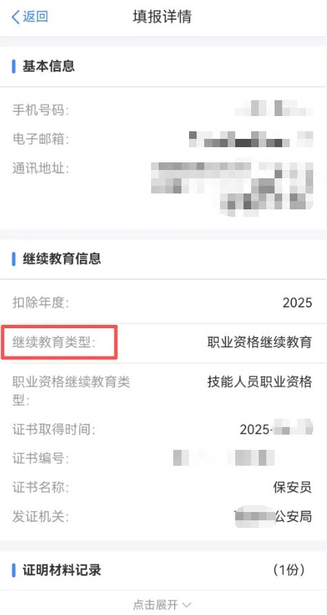 提交报名后,无需自己催进度,全程有工作人员跟进,整体流程简单,通过率超高,50岁以下基本能100%通过,具体流程如下:提交报名后,公安机关会在1个工作日内完成审核,审核通过后,会有工作人员联系你,指引缴纳85元报名费,缴费完成后,等待考试通知(一般1-2个月,以短信通知为准)。考试通知下达后,在指定APP上参加理论考试,题目为随机抽取,题型以选择题、判断题为主,难度较低,只要认真看一遍备考资料,60分合格线很容易达到。理论考试通过后,需前往指定地点参加体能测试,项目包括立定跳远、摸高、俯卧撑等,难度适中。如果体能稍弱,无法通过上述项目,可申请更换为跳绳项目,灵活适配不同人群,无需担心通不过。体能测试通过后,无需额外操作,等待1个月左右,就能拿到保安员证(全国通用,终身有效,无需年审),证书可选择邮寄,全程不用跑窗口。拿到证书后,当年就能在个人所得税APP上申请3600元定额扣除,具体操作步骤超简单:- 打开【个人所得税APP】,找到“专项附加扣除”,点击“继续教育”。