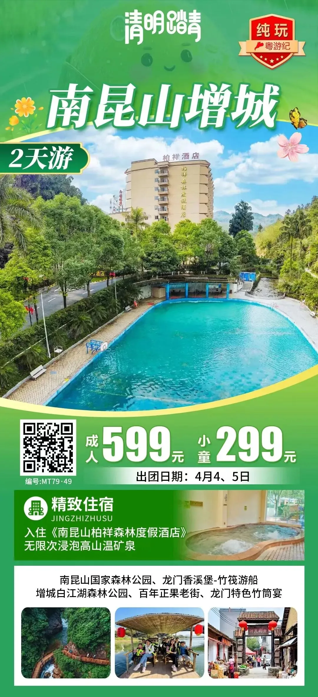 南昆山国家森林公园、入住《南昆山柏祥森林度假酒店》无限次浸泡高山温矿泉、龙门香溪堡-竹筏游船、增城白江湖森林公园、百年正果老街、龙门特色竹筒宴、品质纯玩2天游出团日期:4月4、5日