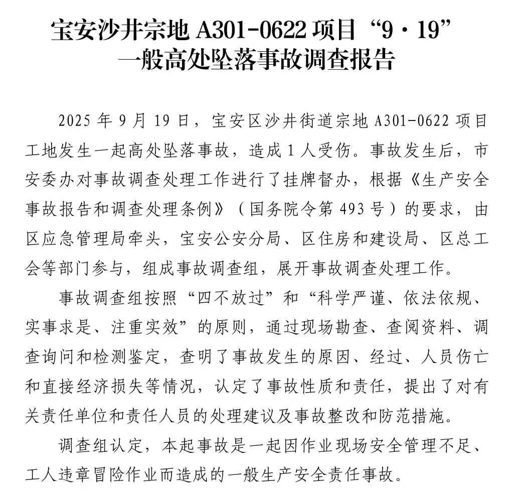 调查报告显示,2025年9月19日,宝安区沙井街道宗地A301-0622项目工地发生一起高处坠落事故,造成1人受伤。
