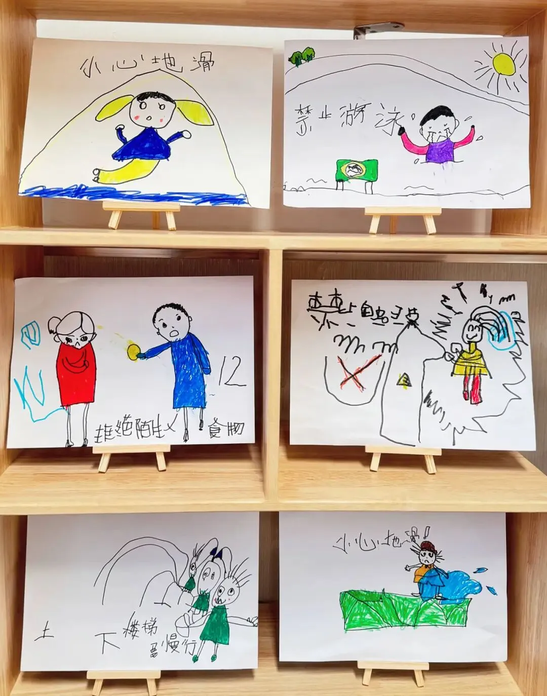 在幼儿园里,上下楼梯要慢慢走,像小火车一样排好队,不推也不挤。