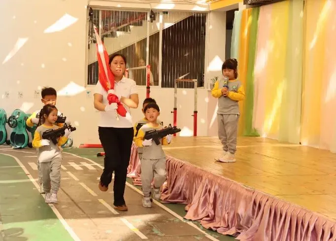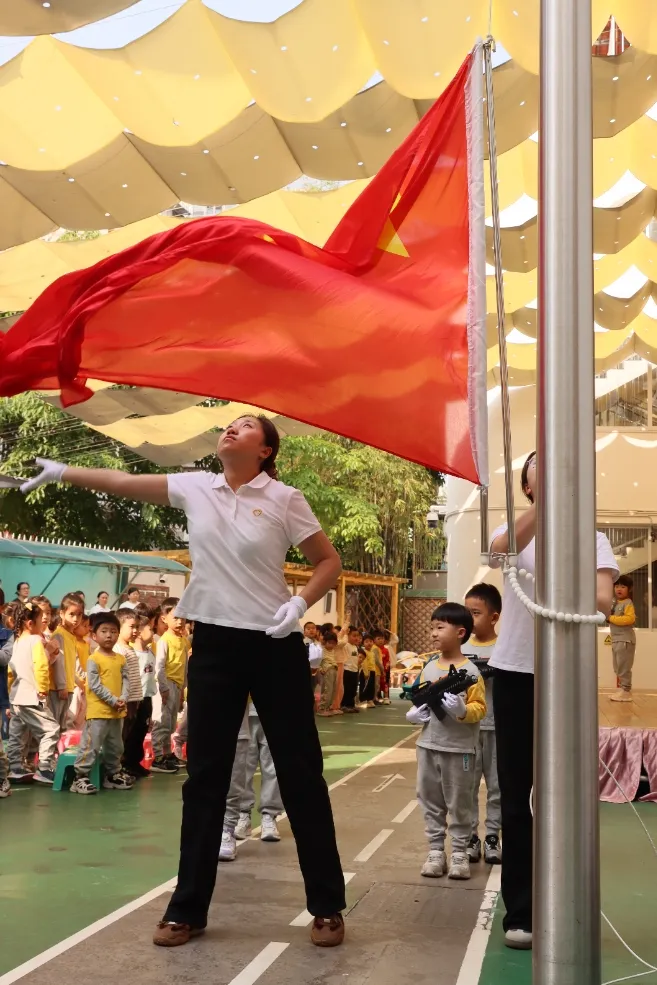 晨会在庄严的升旗仪式中拉开帷幕。小小护旗手们,护送鲜艳的五星红旗,伴随着国歌,全体幼儿面向国旗行注目礼,站姿端正、神情专注,用小小的行动展现爱国情怀。