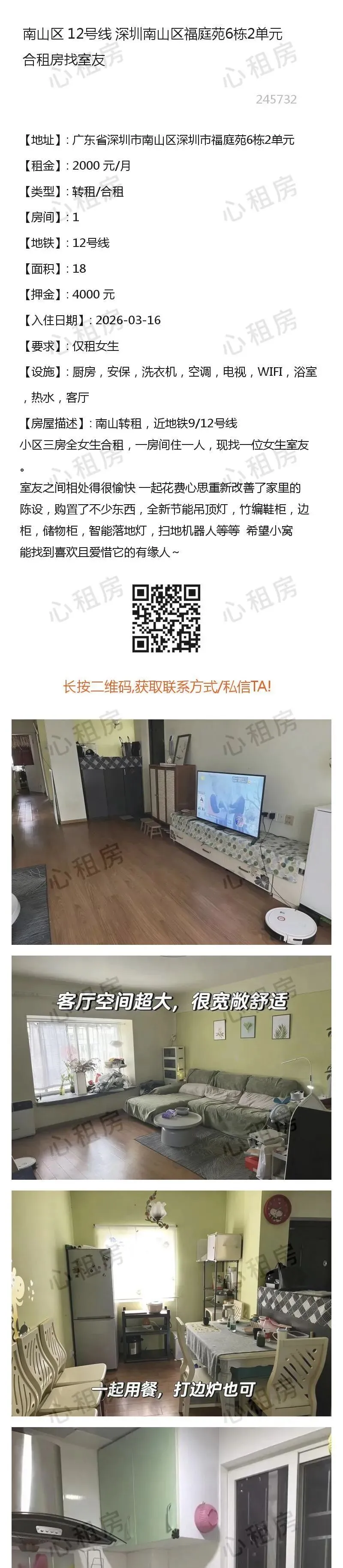 7、近期有人冒充我方线下工作人员,在此特别提醒:本公众号/心租房(homhere.cn)仅提供信息发布,不存在线下工作人员提供服务,请务必谨慎、切勿上当被骗。8、切勿轻信他人,点击他人提供的链接、二维码等,切勿按照他人指示提供验证码、进行转账等操作,谨防上当受骗。9、如遇提供虚假信息、冒充我方工作人员、引诱点击其他网站链接、实施诈骗等行为的,请及时在本公众号对话框里回复:Y,与我方客服联系。