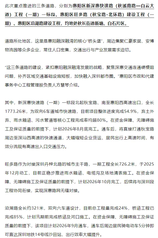 据悉,惠阳区旺多路(秋宝路-北环路)建设工程(一期)、惠阳区沿湖路建设工程已列入2026年惠阳区十大民生实事。接下来。惠阳将持续深耕融深融湾交通互联互通,加快推进跨界道路建设,打通更多瓶颈路、断头路,让交通优势转化为发展优势,助力惠阳在深度融深融湾征程中迈出更坚实步伐。