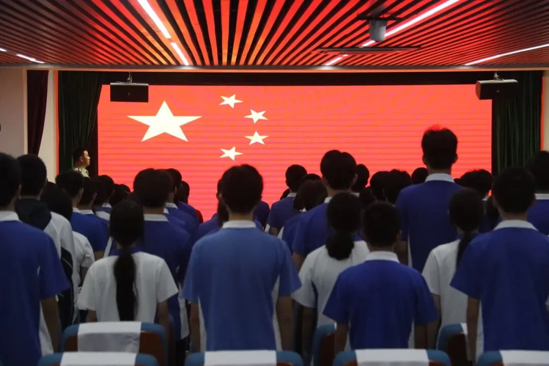 开营仪式在庄严的国歌声中正式开始。全体起立,升国旗,奏唱国歌。学校领导、承训教官及全体高一新生面向国旗行注目礼,现场气氛庄严肃穆。