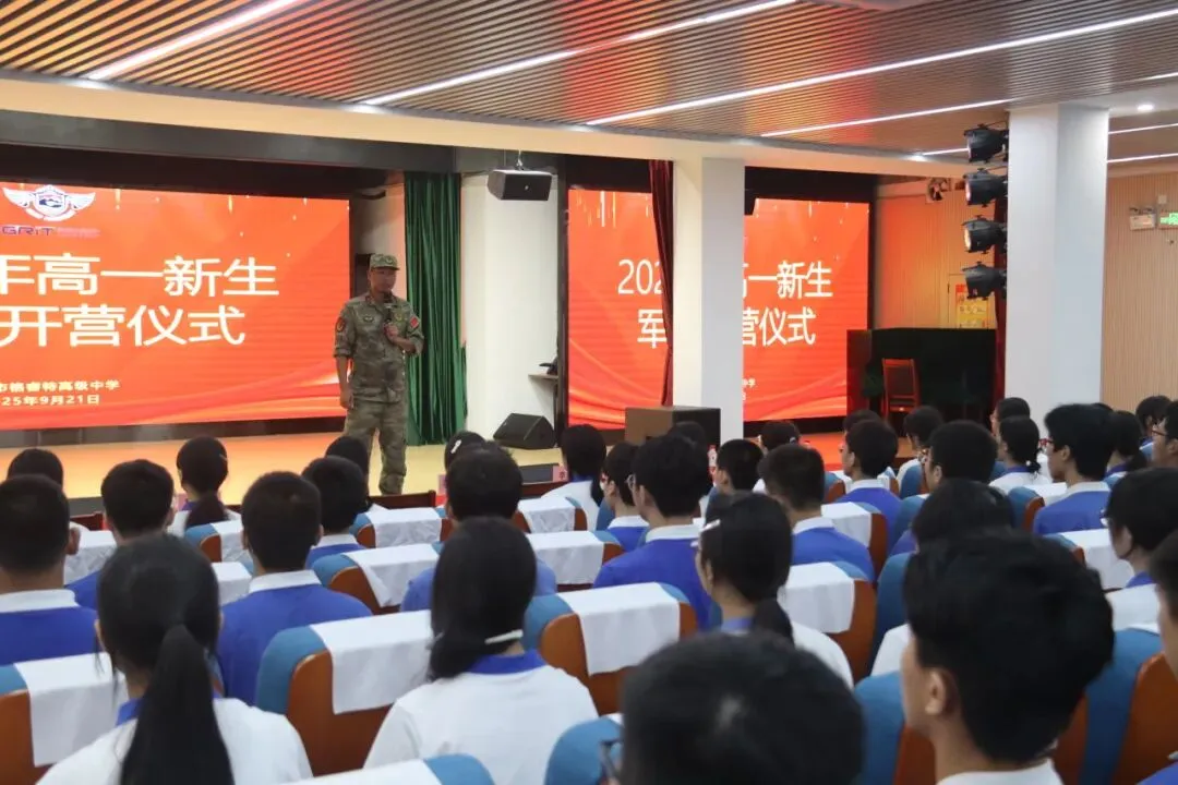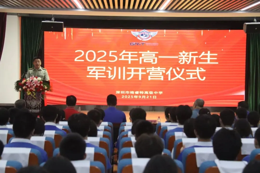 2025年9月21日上午,深圳市格睿特高级中学2025级高一新生军训开营仪式在学校报告厅隆重举行,在尹国府第一书记、李文军书记、陈伟常务副校长、黄俊华教学副校长、军训总教官成学焕教官、德育处赵立平主任等的共同见证下,为期一周的新生军训正式拉开帷幕。本次仪式由陈剑锋教官主持。
