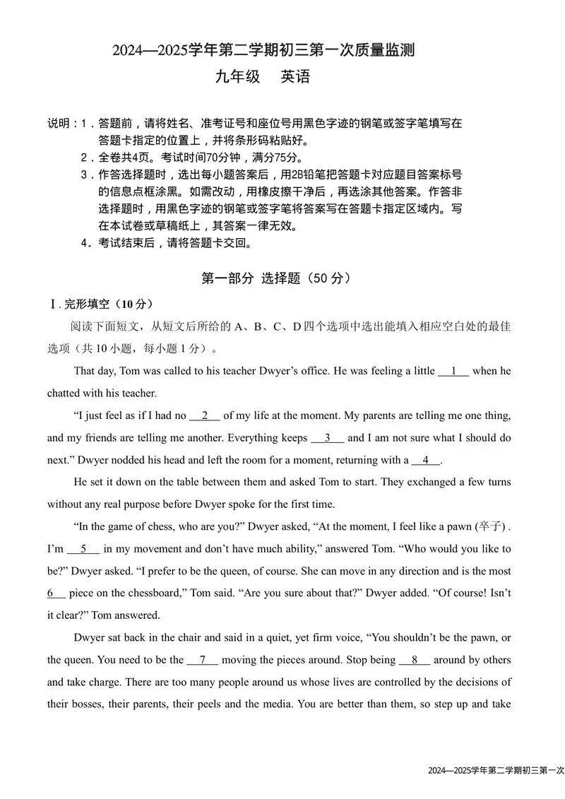 2024-2025学年深圳市南山区育才集团九年级(下)第一次模考英语试卷