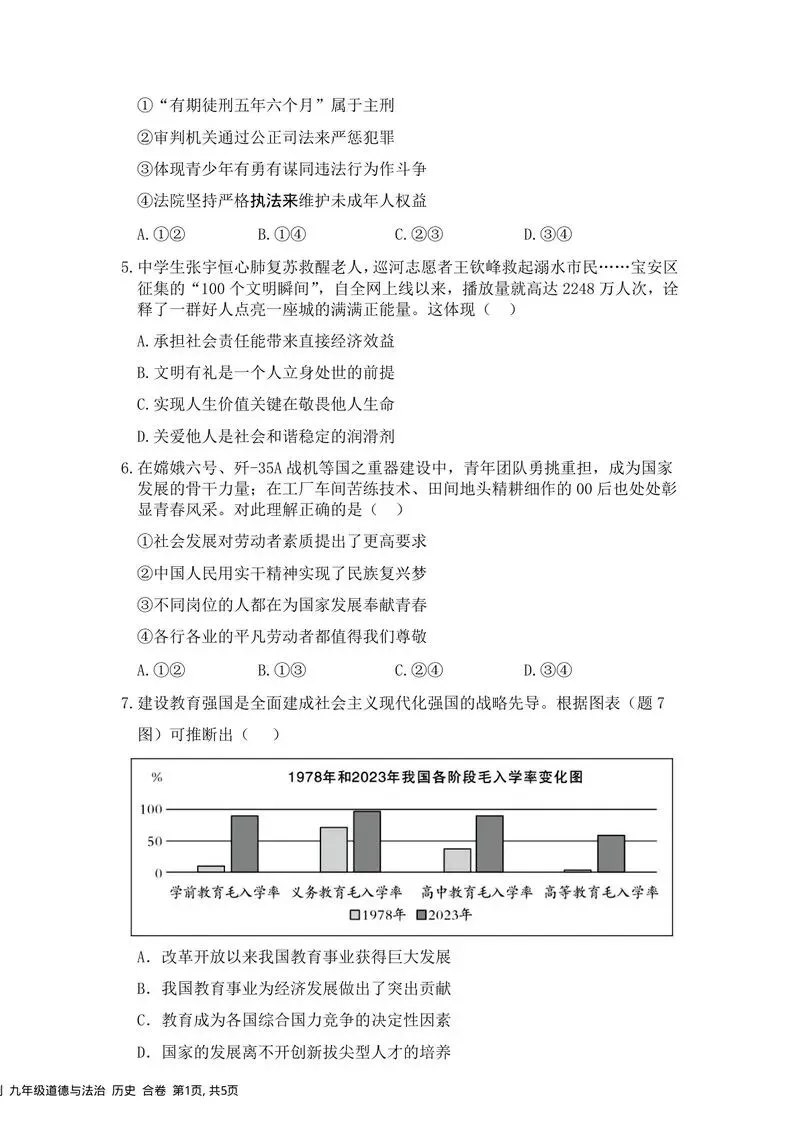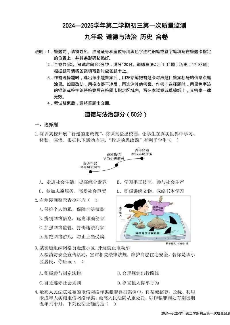 2024-2025学年深圳市南山区育才集团九年级(下)第一次模考道德与法治试卷