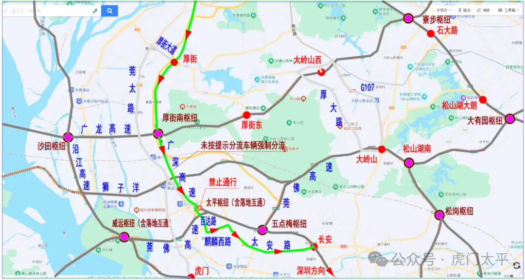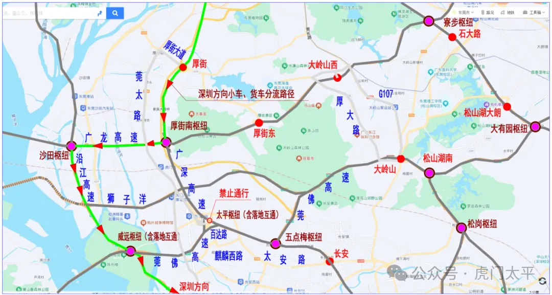 广州往长安至深圳方向车辆分流路线:广深高速→厚街南枢纽→广龙高速公路→沙田枢纽→沿江高速→深圳方向。