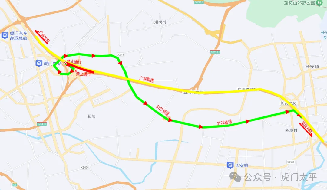 3、广深高速→太平收费站→百达路→虎门大道→S122省道→长安立交→广深高速深圳方向。