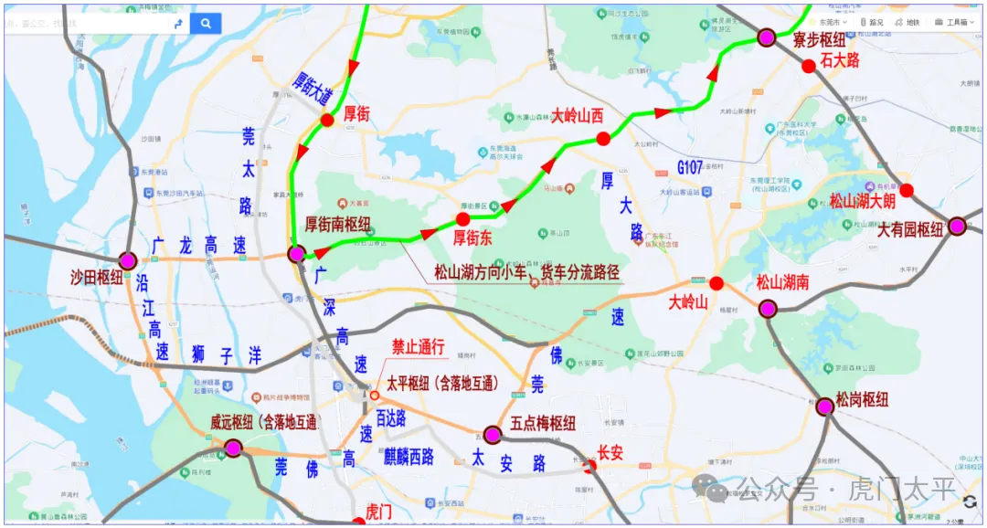 1、广州往松山湖方向客、货车分流路线:广深高速→厚街南枢纽→广龙高速公路→大岭山西收费站→松山湖方向。