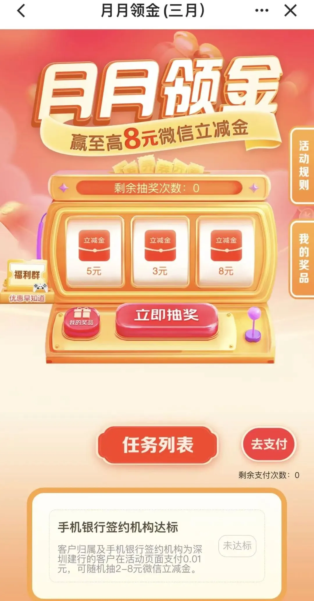 刚用深圳建行卡试了下,0.01元抽中8元立减金,这波必须冲!3月「月月领金」活动来袭,无需消费、不用凑单,支付1分钱直接抽奖,最高8元微信立减金白拿!