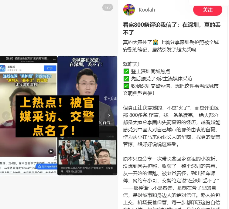 3月24日,马来西亚网友“Koolah”分享的深圳寻护照经历在深圳人的社交平台刷屏。3月25日,经过深圳晚报首发及独家专访后,相关话题迅速登上同城热搜,引发全国网友的关注。