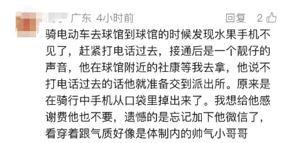 广东网友称:“骑电动车去球馆到球馆的时候发现苹果手机不见了,赶紧打电话过去,接通后是一个靓仔的声音,他在球馆附近的社康等我去拿,他说不打电话过去的话他就准备交到派出所。原来是在骑行中手机从口袋里掉出来了。我想给他感谢费他也不要。”